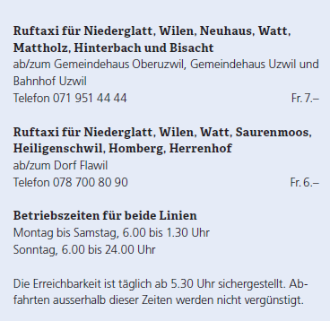 - Ab Flawil sind Fahrten in die Weiler Niederglatt, Wilen, Watt, Saurenmoos, Heiligenschwil, Homberg und Herrenhof möglich – jeweils in beide Richtungen.