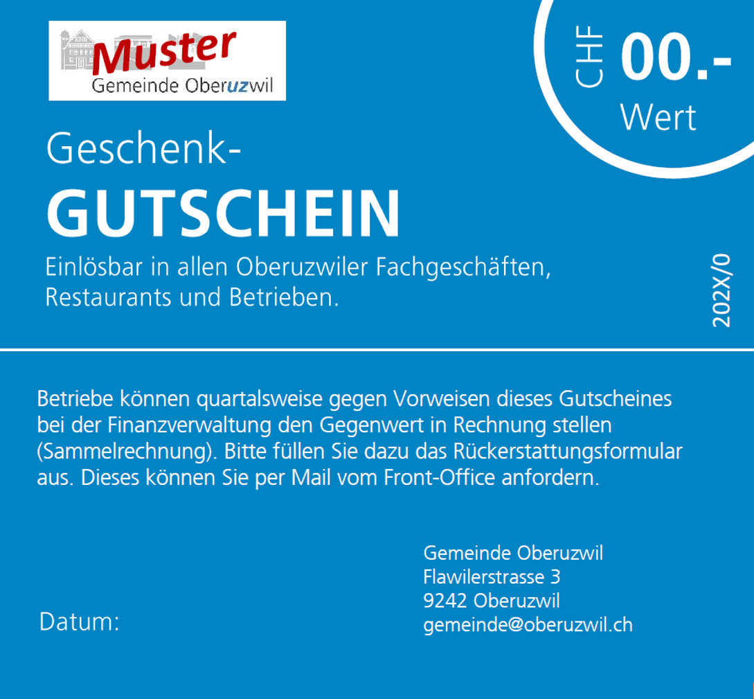 Die Gemeinde Oberuzwil unterstützt Sie und allgemein das Gewerbe. Wenn wir Präsente an Personen verteilen, die in unserer Gemeinde tolles geleistet haben oder erfolgreich waren, profitieren künftig alle davon. Wir produzieren einen eigenen Oberuzwiler Gutschein. Mit dieser Initiative möchten wir die lokale Wertschöpfung fördern und das Gewerbe in unserer Gemeinde gezielt unterstützen.